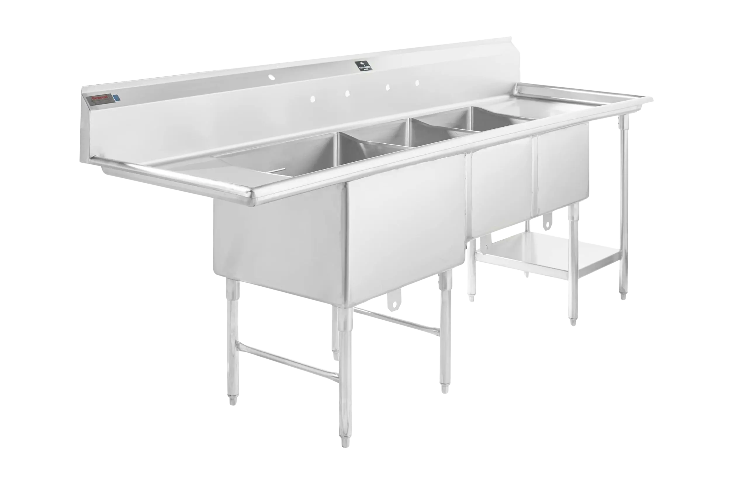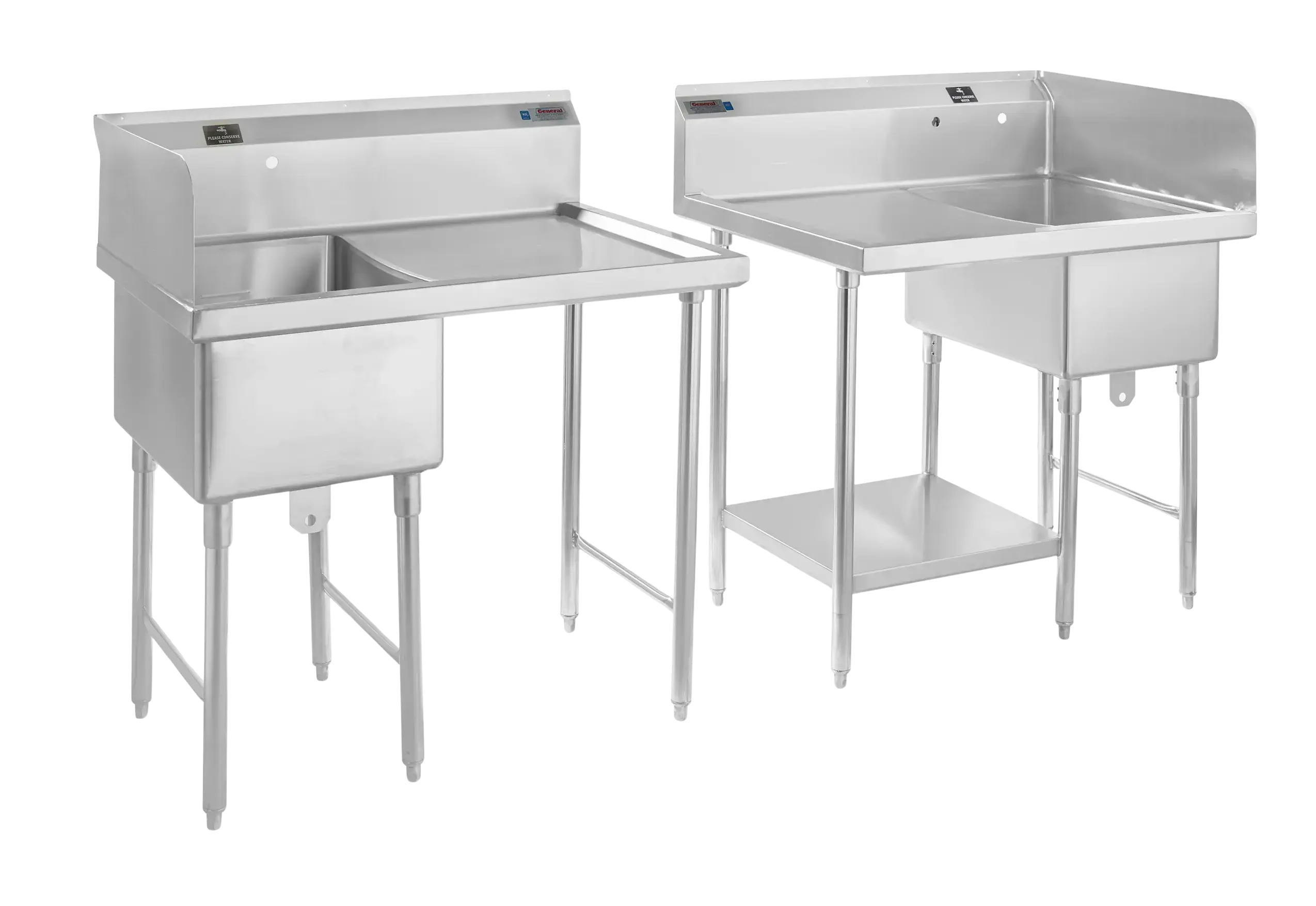 Our commercial compartment sinks feature durable 16-gauge polished stainless steel, rounded corners for easy cleaning, and raised edges to reduce splashes.