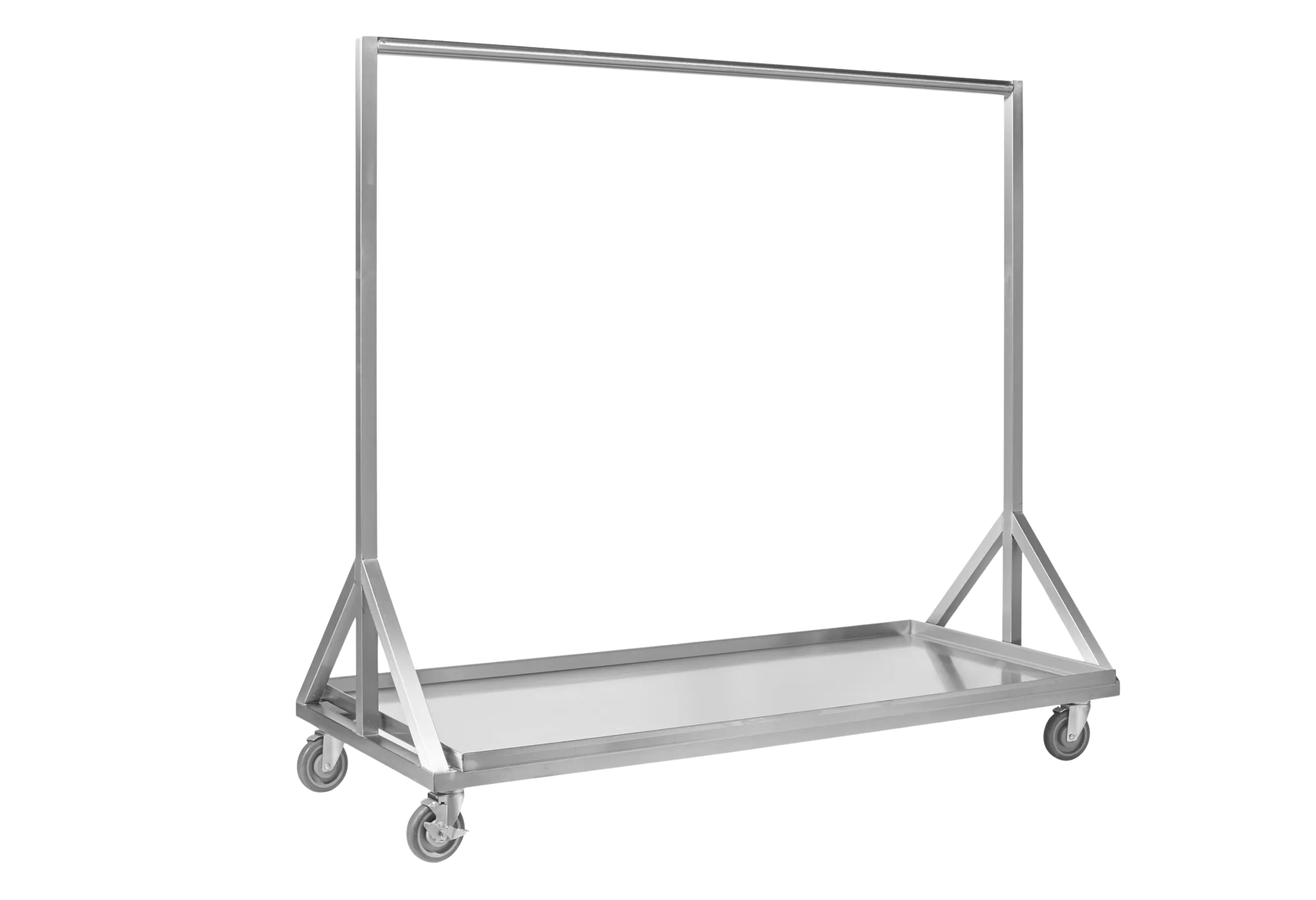Durable 16-gauge polished stainless steel rack designed to showcase BBQ or roast duck. Includes a removable drip tray and smooth-rolling casters.
